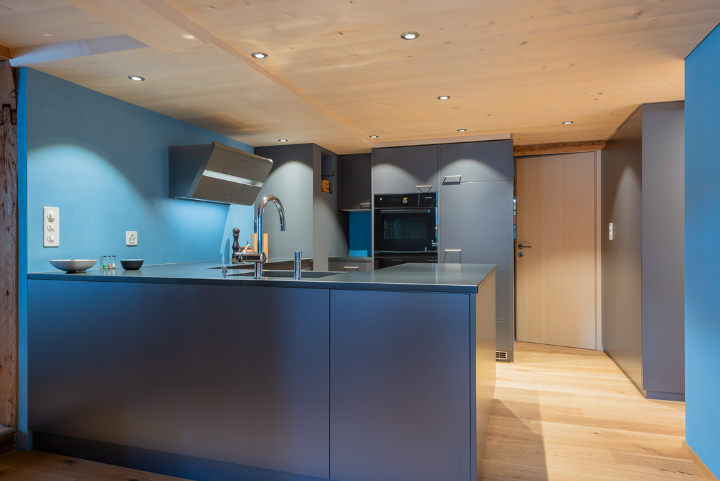 - Mehr zum Projekt: Der Umbau einer Wohnung mitten im alten Dorfkern von Ernen ist eine besondere Herausforderung. Erstens steht das Dorfbild als ganzes unter Schutz und zweitens gelten auch die einzelnen Häuser als schützenwerte Baudenkmäler. Es gilt, die vielfältigen Bauvorschriften zum Erhalt der historischen Bausubstanz mit den Erwartungen der Bauherrschaft an einen modernen und zeitgemässen Wohnstil in Einklang zu bringen – und das alles unter Einhaltung klarer Budgetziele. Die letztmals in den 70er Jahren erneurte Wohnung wurde komplett ausgehöhlt. Wände wurden entfernt, Böden demontiert und durch neue, isolierte Bodenelemente ersetzt. Alte Elemente wie Balken und zum Teil auch Türen wurden aufgefrischt und zum Teil wieder verbaut. Die energtische Sanierung wurde dank einer Wärmedämmung auf Holzfaserbasis umgesetzt. Parkettböden wurden verlegt und neue Fenster und Türen eingebaut. Die neue Küche wurde auf Mass gefertigt und neue Badzimmermöbel wurden ebenfalls installiert.